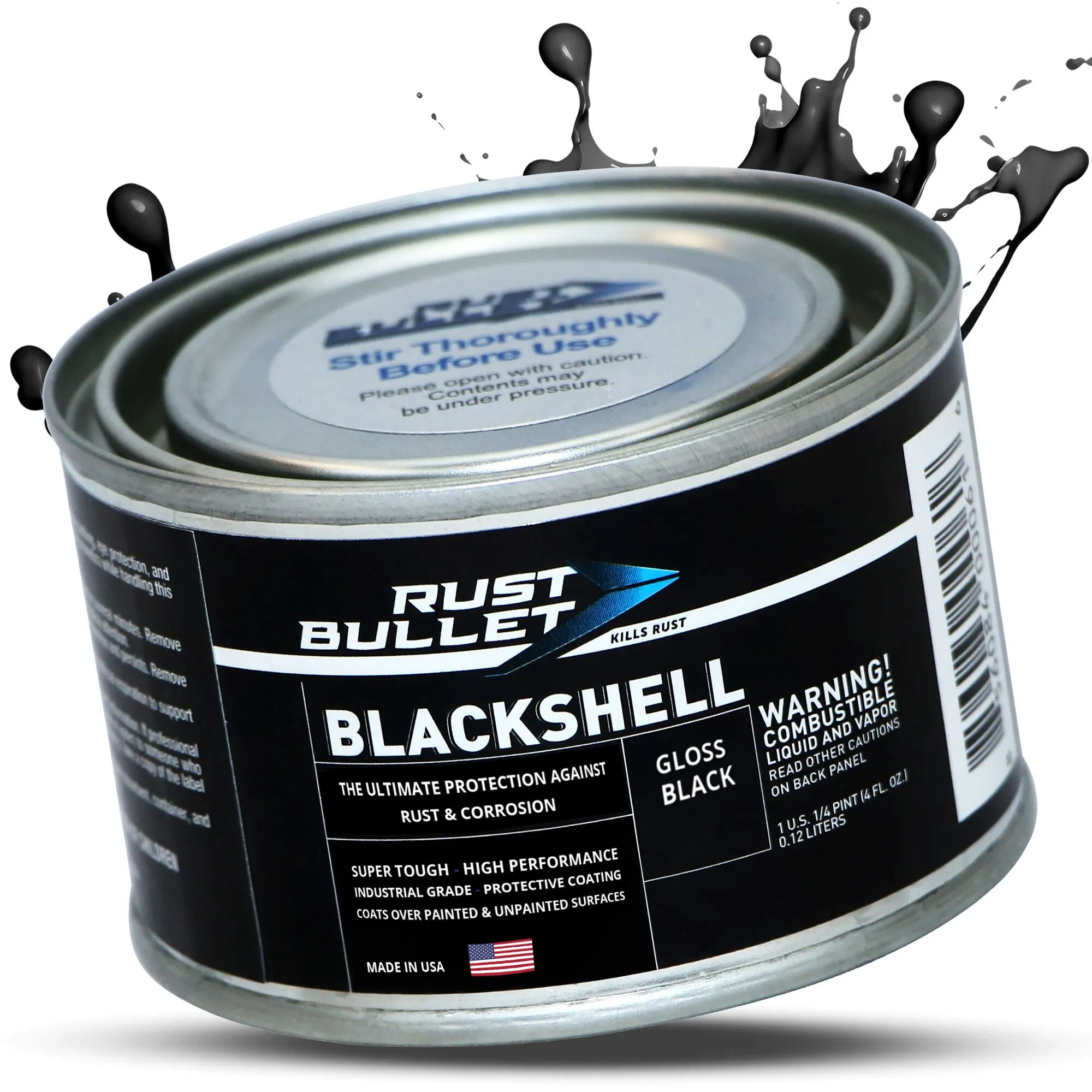 1/4 Pint – Get a brilliant, high-gloss finish with Rust Bullet® BlackShell® Gloss. This rust-inhibitive coating provides UV-resistant, chip-proof armor for metal. Use alone or as a durable topcoat. BlackShell Gloss is a robust, all-in-one solution. When used alone, a minimum 2-coat application provides a long-lasting, glossy black barrier that locks out rust for years. Apply BlackShell Gloss as a tough, protective topcoat over Rust Bullet Automotive or Industrial formulas. This creates an unparalleled, armor-tough barrier that is exceptionally resistant to chips, scratches, and corrosive chemicals. Ideal for automotive parts, industrial equipment, machinery, railings, and any project where a durable, glossy, protective finish is required.