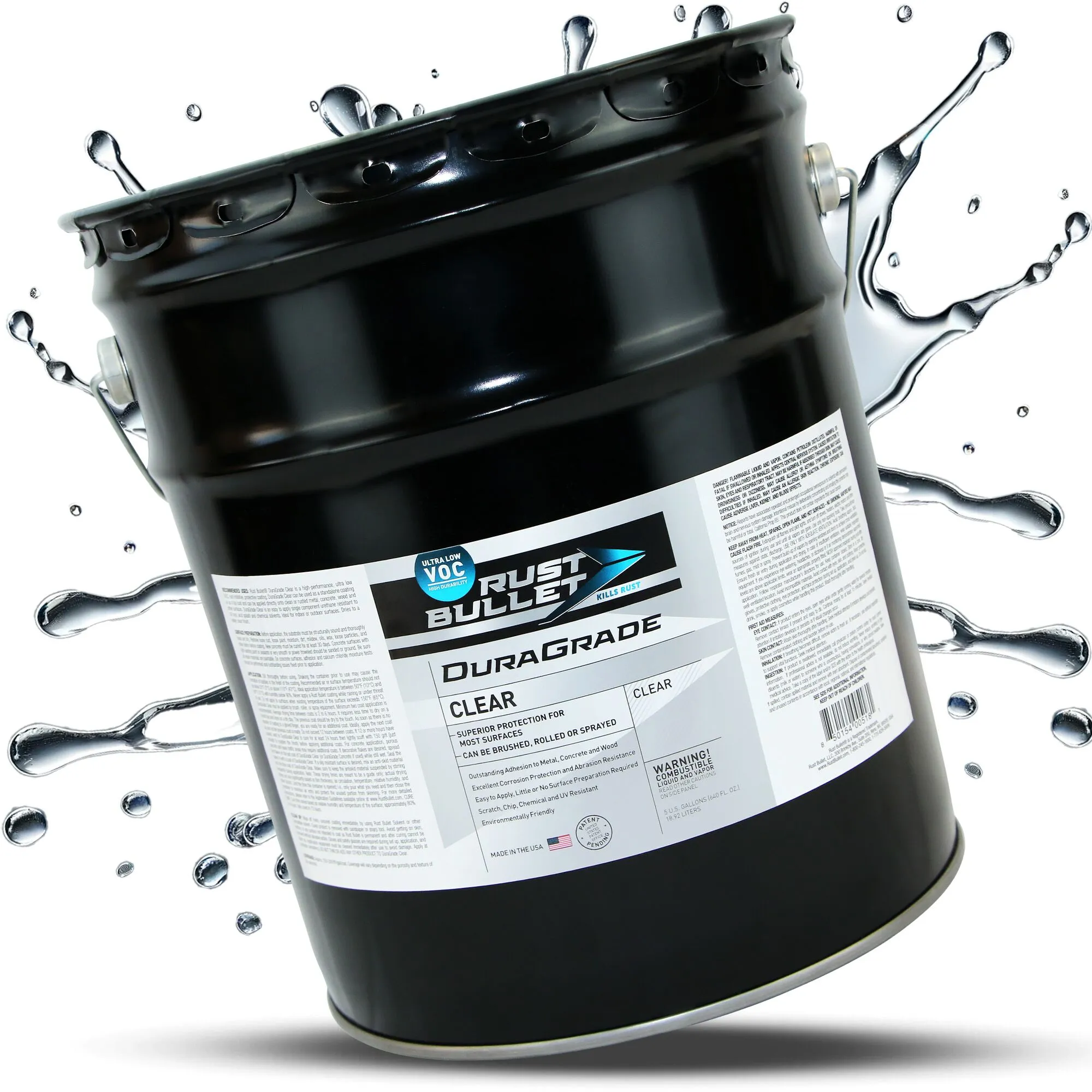 5 Gallon Pail – Rust Bullet DuraGrade Clear is a high-performance, ultra-low VOC, rust inhibitive, protective coating. With just 49 g/l of VOCs, DuraGrade Clear’s patent pending formula is an environmentally preferred ultra-low VOC coating compliant in every state and air quality management district. DuraGrade Clear can be used as a standalone coating or as a top coat and can be applied directly onto clean or rusted metal, concrete, wood and other surfaces. DuraGrade Clear has superior adhesion and provides excellent corrosion protection and abrasion resistance. Easy to apply by brush, roller, or spray equipment. Scratch, chip, chemical and UV Resistant. Ideal for indoor or outdoor surfaces. Perfect for sealing in decorative flakes. Anti-skid material can be added for a slip-resistant surface. Dries to a water clear finish. Covers approximately 1750 square feet per 5 gallon pail, per coat.