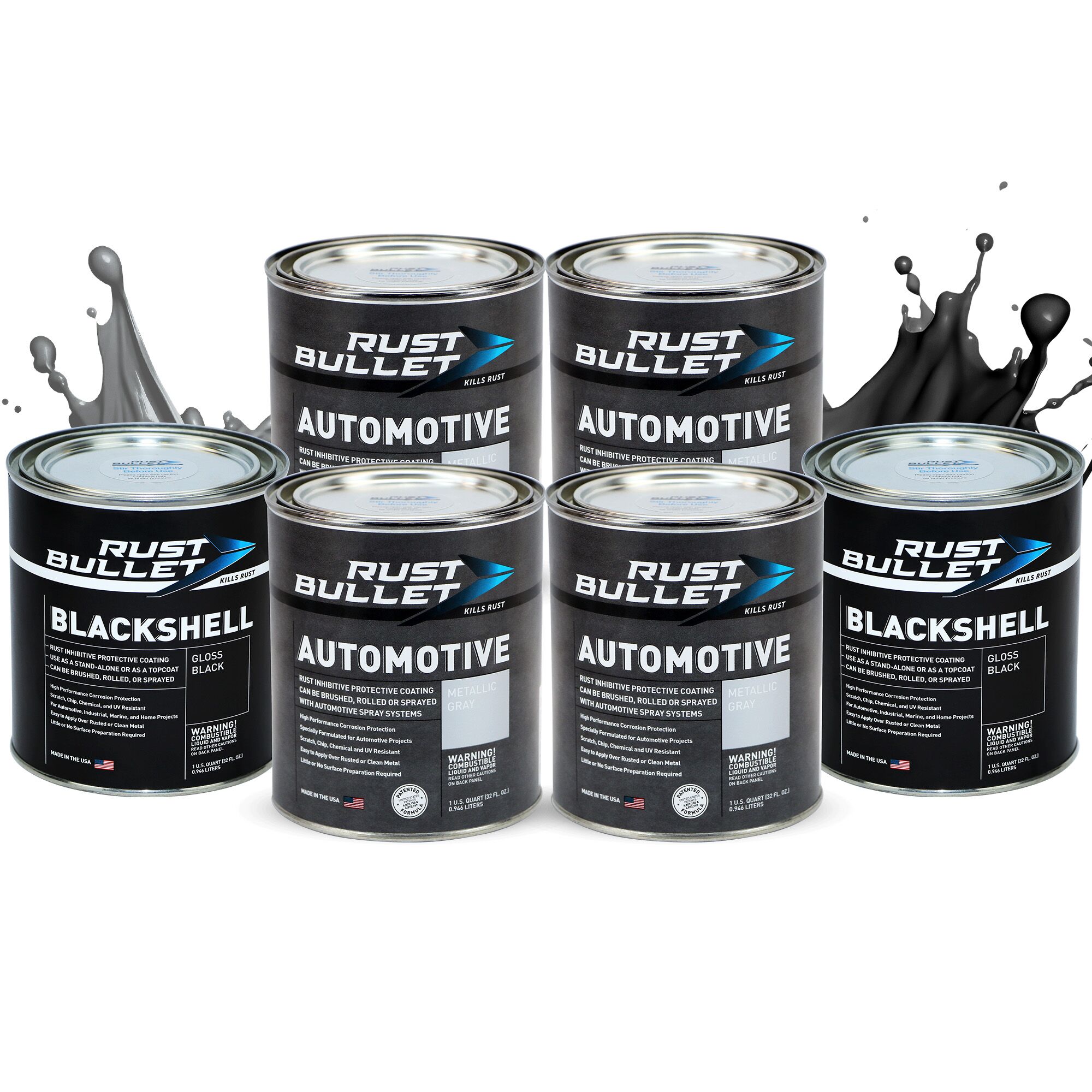 6 Quart Combo – The Rust Bullet Automotive 6 Quart Combo package contains 4 Quarts of Rust Bullet Automotive Formula (Metallic Gray) and your choice of 2 Quarts of Rust Bullet BlackShell or WhiteShell for your topcoat. This combo allows you to open smaller units of Rust Bullet as needed providing convenience, savings and minimizing waste.