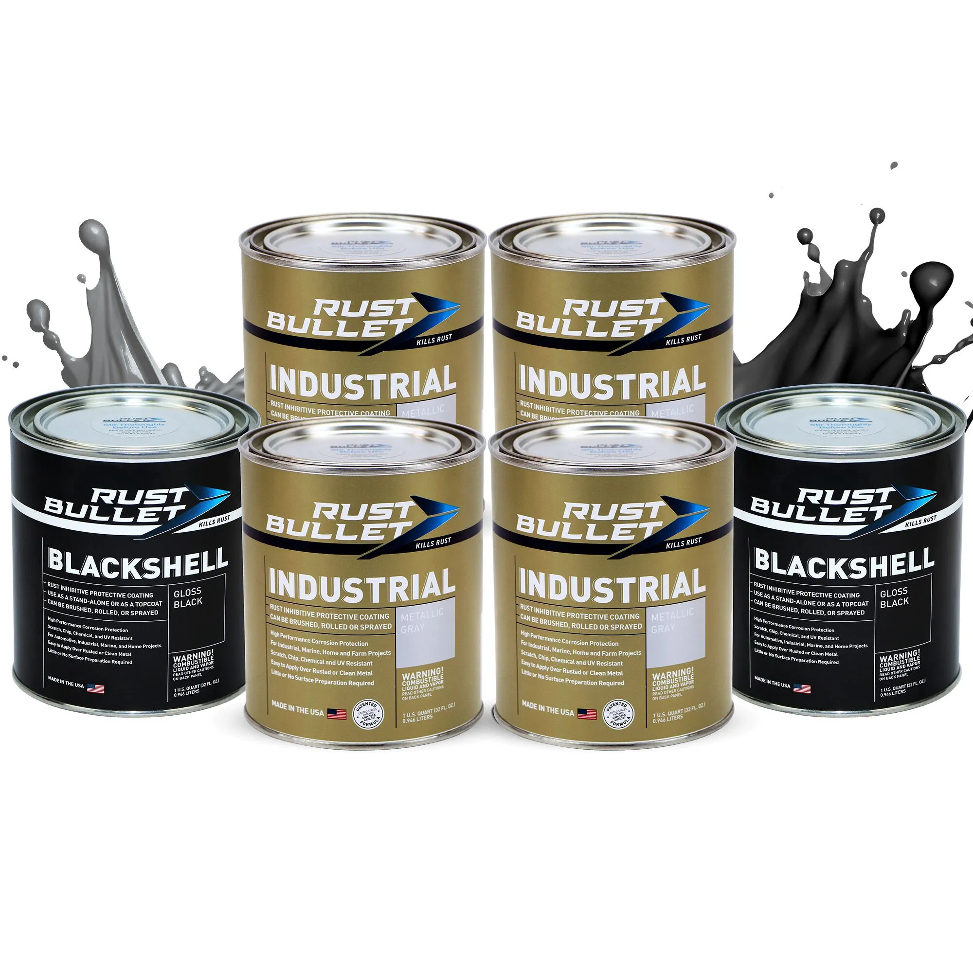 Six Quart Combo – The Rust Bullet Industrial 6 Quart Combo package contains 4 Quarts of Rust Bullet Industrial Formula (Metallic Gray) and your choice of 2 Quarts of Rust Bullet Topcoat. Choose from our Rust Bullet BlackShell or Rust Bullet WhiteShell for your topcoat options. This combo allows you to open smaller units of Rust Bullet as needed providing convenience, savings and minimizing waste.
