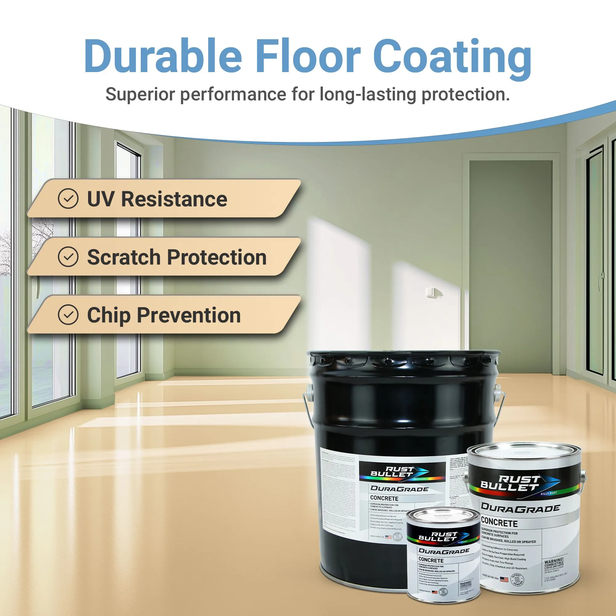 Available in a Quart, Gallon, or 5 Gallon Pail – Rust Bullet DuraGrade Concrete is a high-performance, durable coating specifically designed for concrete surfaces. DuraGrade Concrete provides exceptional protection against water, chemicals, UV rays, and abrasive conditions, making it ideal for both indoor and outdoor surfaces. Unlike traditional epoxy concrete coatings, Rust Bullet DuraGrade Concrete can be applied directly over concrete without the need for acid etching, grinding, or blasting. This saves time and labor costs. It is suitable for a wide range of applications including garages, warehouses, industrial floors, and even decorative concrete surfaces. Rust Bullet DuraGrade Concrete is an excellent choice for anyone seeking a reliable, easy-to-use, and long-lasting concrete coating solution. Whether for industrial, commercial, or residential use, it provides an efficient and cost-effective way to protect and enhance concrete surfaces.