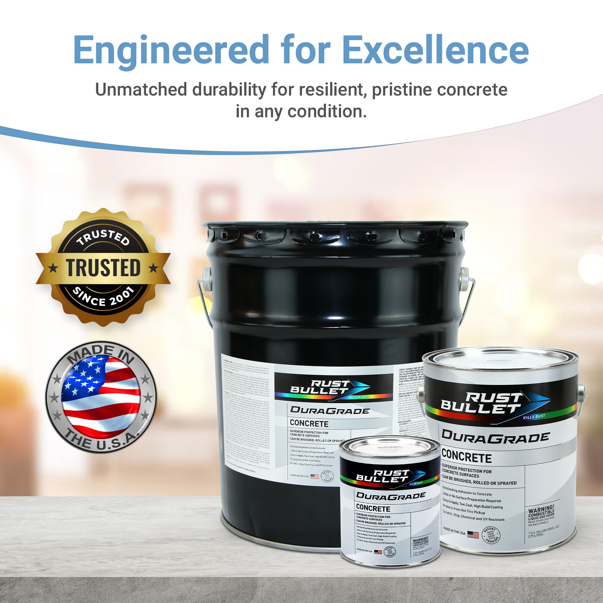 Available in a Quart, Gallon, or 5 Gallon Pail – Rust Bullet DuraGrade Concrete is a high-performance, durable coating specifically designed for concrete surfaces. DuraGrade Concrete provides exceptional protection against water, chemicals, UV rays, and abrasive conditions, making it ideal for both indoor and outdoor surfaces. Unlike traditional epoxy concrete coatings, Rust Bullet DuraGrade Concrete can be applied directly over concrete without the need for acid etching, grinding, or blasting. This saves time and labor costs. It is suitable for a wide range of applications including garages, warehouses, industrial floors, and even decorative concrete surfaces. Rust Bullet DuraGrade Concrete is an excellent choice for anyone seeking a reliable, easy-to-use, and long-lasting concrete coating solution. Whether for industrial, commercial, or residential use, it provides an efficient and cost-effective way to protect and enhance concrete surfaces.