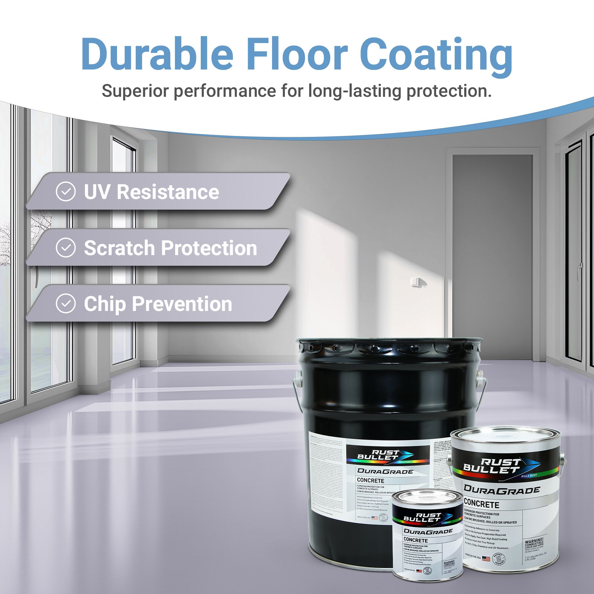 Available in a Quart, Gallon, or 5 Gallon Pail – Rust Bullet DuraGrade Concrete is a high-performance, durable coating specifically designed for concrete surfaces. DuraGrade Concrete provides exceptional protection against water, chemicals, UV rays, and abrasive conditions, making it ideal for both indoor and outdoor surfaces. Unlike traditional epoxy concrete coatings, Rust Bullet DuraGrade Concrete can be applied directly over concrete without the need for acid etching, grinding, or blasting. This saves time and labor costs. It is suitable for a wide range of applications including garages, warehouses, industrial floors, and even decorative concrete surfaces. Rust Bullet DuraGrade Concrete is an excellent choice for anyone seeking a reliable, easy-to-use, and long-lasting concrete coating solution. Whether for industrial, commercial, or residential use, it provides an efficient and cost-effective way to protect and enhance concrete surfaces.