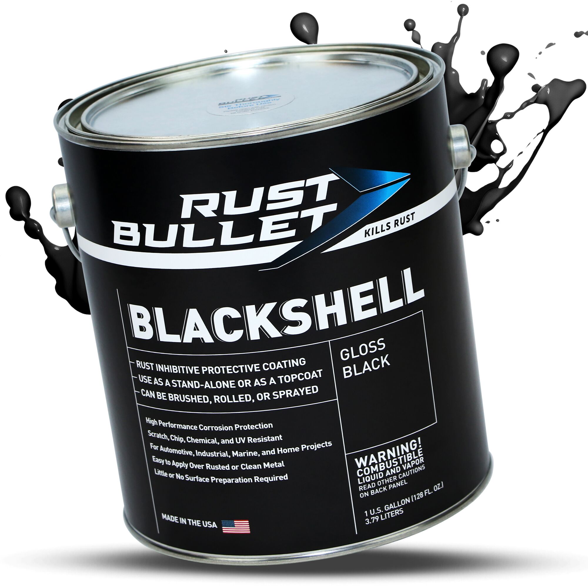 Gallon – Get a brilliant, high-gloss finish with Rust Bullet® BlackShell® Gloss. This rust-inhibitive coating provides UV-resistant, chip-proof armor for metal. Use alone or as a durable topcoat. BlackShell Gloss is a robust, all-in-one solution. When used alone, a minimum 2-coat application provides a long-lasting, glossy black barrier that locks out rust for years. Apply BlackShell Gloss as a tough, protective topcoat over Rust Bullet Automotive or Industrial formulas. This creates an unparalleled, armor-tough barrier that is exceptionally resistant to chips, scratches, and corrosive chemicals. Ideal for automotive parts, industrial equipment, machinery, railings, and any project where a durable, glossy, protective finish is required.