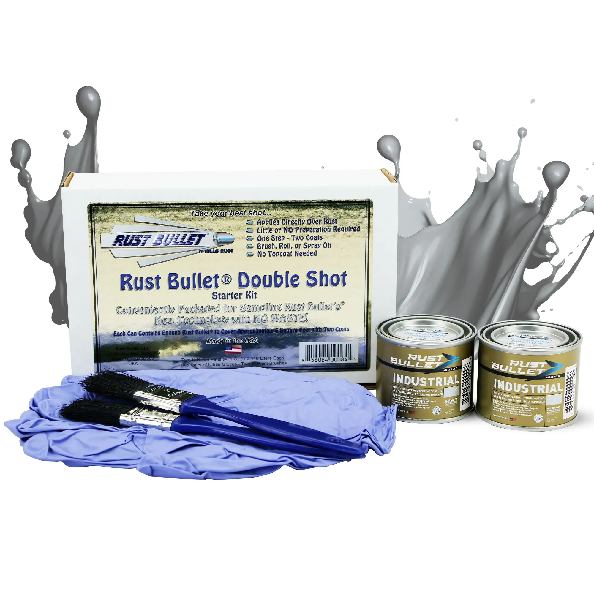 Conveniently packaged for you to utilize Rust Bullet’s New Technology with NO WASTE! These two-four ounce cans contain enough Rust Bullet to cover approximately 12 square feet, per coat, per individual can (24 square feet per coat, per kit) – minimum 2 coat application required. For your convenience, we have included two pairs of Industrial Grade Nitrile Gloves and (2) 1 inch Paint Brushes: everything you need for a small project or touch-ups. Metallic gray in color. All Rust Bullet Coatings may be applied by brush, roller, or spray equipment.