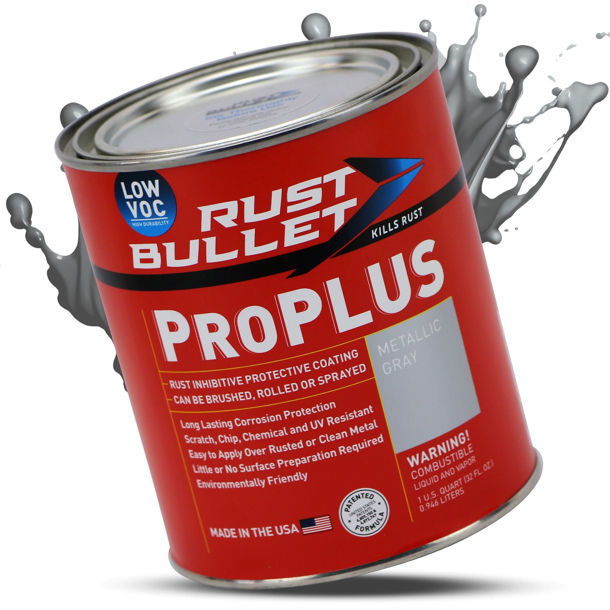 Quart – Stop rust permanently with Rust Bullet ProPLUS rust preventative coating. Twice the quality and about half the cost of competing products. A unique one step process awarded two United States Patents that is simple to apply, low maintenance, super tough, high performance rust paint. Metallic grey in color. Use to stop rust for mostly any metal surface in any industry. Low VOC formula compliant in all 50 states.