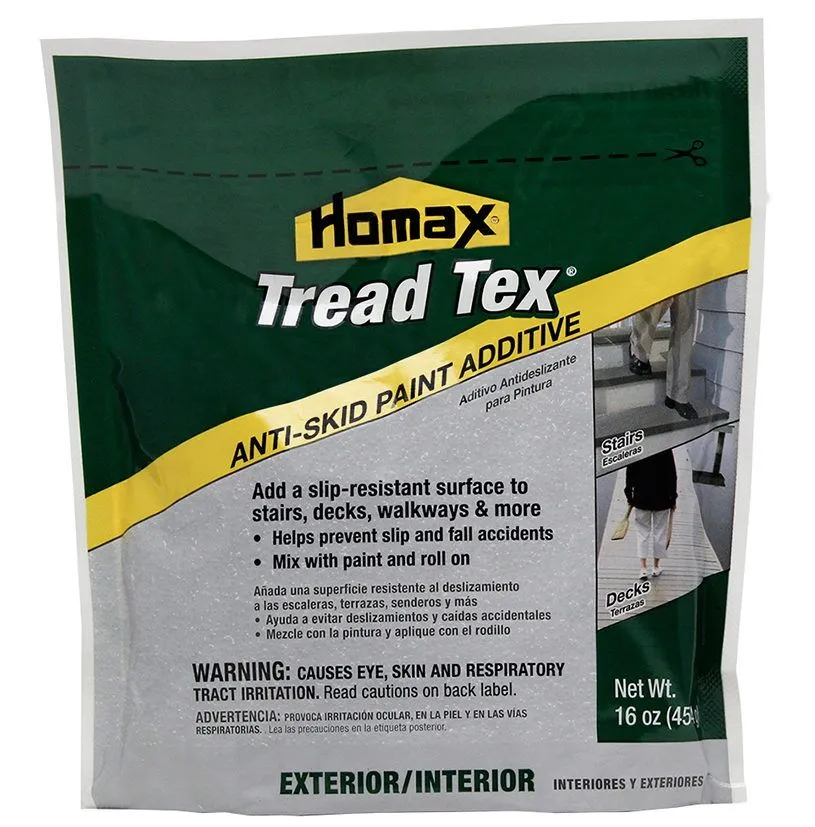 Homax® Tread-Tex® Anti-Skid Paint Additive is a fine aggregate material that can be added to any floor paint to provide a skid-resistant surface. When painting, add skid-resistant safety to stairs, floors, decks, docks, and more. Tread-Tex can be used on interior or exterior surfaces where slipping is likely to occur. The 16 oz. bag mixes with one gallon of paint.