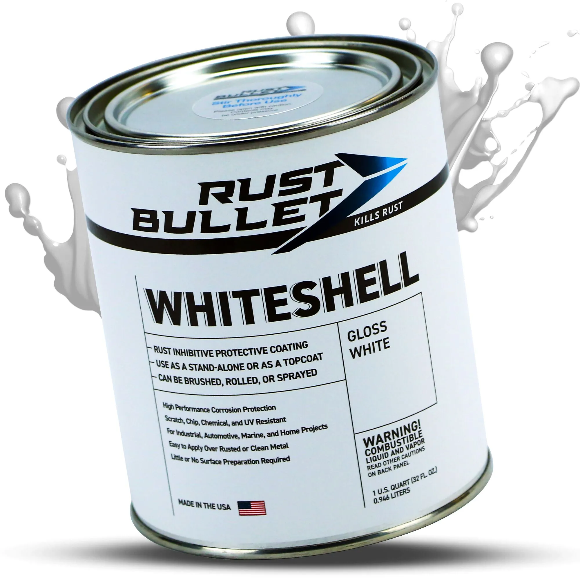 Quart – Rust Bullet WhiteShell is a single component, gloss white, protective coating and topcoat; Easily applied over painted or unpainted surfaces and can be used as a stand-alone protective coating that will protect your iron and steel. For the ultimate protection, apply WhiteShell as a topcoat over our patented Rust Bullet Industrial or Rust Bullet Automotive Formulas to create the strongest armor tough, chip resistant protection against rust and corrosion ever formulated. WhiteShell is UV Resistant, scratch and chip resistant, can be brushed, rolled, or sprayed, and dries to a gloss black finish. If used as a stand-alone protective coating, minimum 2 coat application required. Coverage is approximately 100 square feet per quart, per coat.